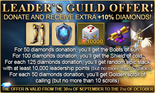 We are pleased to announce the start of our Leader's Promotion! From now on and up until October 7th, 2025 inclusive, with each diamonds purchase you will get additionally +10% of diamonds.