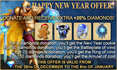 We are pleased to announce the start of our Special New Year Offer! From now on and up until January 6th, 2026 inclusive, with each diamonds purchase you will get additionally +20% of diamonds.
