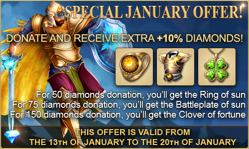 We are pleased to announce the start of our Special January Offer! From now on and up until January 20th, 2026 inclusive, with each diamonds purchase you will get additionally +10% of diamonds.