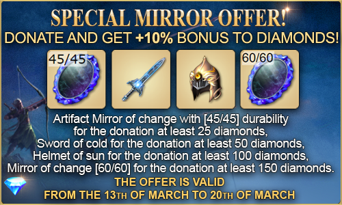 We are announcing about the special Mirror's Sale! Starting today and through 20th of March 2026, buy Diamonds and get +10% for free.