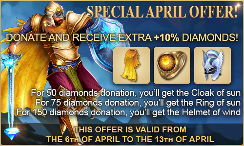 We are pleased to announce the start of our Special April Offer! From now on and up until April 13th, 2026 inclusive, with each diamonds purchase you will get additionally +10% of diamonds.
