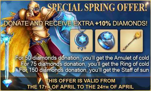 We are pleased to announce the start of our Special Spring Offer! From now on and up until April 24th, 2026 inclusive, with each diamonds purchase you will get additionally +10% of diamonds.